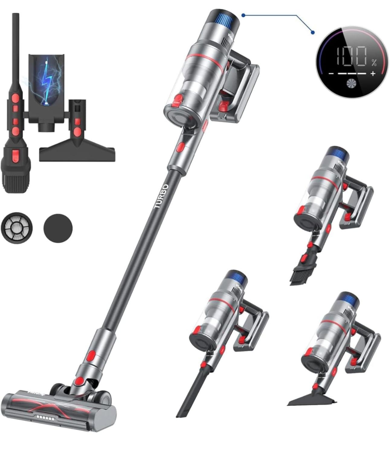 CEPILLO MOTORIZADO LED FLEXIBLE Y PANTALLA TÁCTIL INTELIGENTE: El Stick Vacuum cuenta con un cuello que proporciona dirección giratoria de 0° a 180° hacia los lados y de 0° a 90° hacia arriba y hacia abajo. Nuestra aspiradora está equipada con una pantalla táctil para una interfaz fácil de usar, por eso puede ver los modos de limpieza, el nivel de la batería, el nivel de succión y el rendimiento en tiempo real. Mientras tanto, con la ayuda de los faros, maniobrarás fácilmente alrededor de muebles y alfombras sin perder un paso.\nSistema de filtración de 6 etapas de alta eficiencia: el sistema de filtración de 6 capas de la aspiradora inalámbrica atrapa el 99,97% de partículas microscópicas tan pequeñas como 0,3 micras y expulsa aire más limpio y puro para sus familias. El filtro HEPA lavable debe limpiarse o reemplazarse regularmente para evitar obstrucciones y reducir la potencia de succión.\nDetección automática de polvo inteligente: la potente aspiradora inalámbrica ajusta automáticamente la potencia de succión dependiendo de la cantidad de suciedad (11 Kpa a 32 Kpa). Deje que su aspiradora alfombra y piso piensen con el sensor inteligente para eliminar la tensión de la limpieza diaria. Funciona en modo automático y reduce la potencia en tiempo real para extender el tiempo de funcionamiento de la batería.\nMultifuncional y servicio al cliente: nuestra aspiradora inalámbrica viene con múltiples cabezales de cepillo, por lo que es fácil limpiar escaleras, interiores de automóviles, cortinas y otros lugares difíciles de alcanzar.