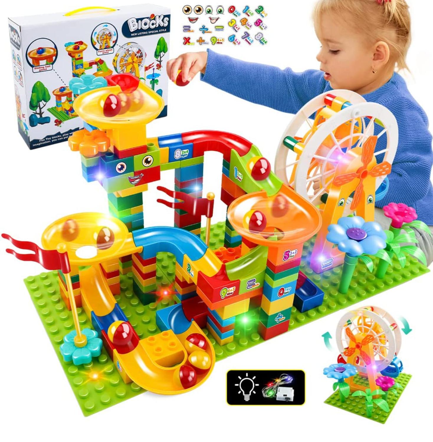 uego perfecto de 186 piezas que pueden hacer diferentes modelos de tachuelas simples y complejas. Tu pequeño puede usar bloques para construir varios modelos para mejorar la creatividad y la capacidad práctica de los niños.\n►Material seguro de alta calidad: este juego de canicas viene con tantos bloques de alta calidad, que no son absolutamente tóxicos. Además, los bloques son lisos, redondeados y sin bordes astillados. Este juego proporciona bolas más grandes que son de plástico seguro en lugar de vidrio para proteger a tu pequeño del peligro. En cualquier momento, ponemos la seguridad de su hijo como nuestra máxima prioridad.\n►Juguete educativo perfecto: es un juguete de aprendizaje muy atractivo que ayuda con la resolución de problemas y la atención a la tarea. Es divertido para una variedad de edades. Es perfecto para tus hijos, porque hay cientos de formas de juntar los bloques, por lo que cada vez es como jugar con él por primera vez. Además, puede mejorar la imaginación, la curiosidad, la resolución de problemas, la creatividad, el reconocimiento de formas\n►El mejor regalo para niños: con este juego de canicas perfecto, puede dar a tu pequeño entretenimiento sin fin y mantener a los niños lejos de las pantallas. Regalo perfecto para niñas y niños pequeños a partir de 3, 4, 5, 6, 7+.