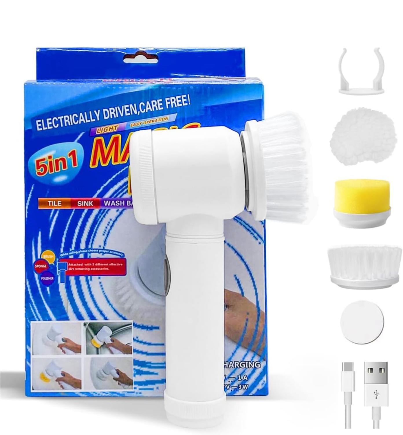 Limpieza más fácil y ahorra tiempo: este potente limpiador eléctrico comienza una rotación de 360°, puede ahorrar la mitad del tiempo de limpieza, lo que te permite limpiar fácil y eficazmente las manchas difíciles y los puntos sucios, y cuidar tus rodillas y espalda. Sé tu buen ayudante para la limpieza.\nDiferentes cepillos satisfacen diferentes necesidades: el limpiador con 3 cepillos intercambiables que te permiten limpiar diferentes superficies con facilidad. El cepillo de esponja es adecuado para lavar platos, el cepillo plano es adecuado para limpiar pisos, azulejos, horno y estufa. El cepillo de pulido es adecuado para limpiar vidrios.\nCarga inalámbrica y USB: el cepillo eléctrico de mano inalámbrico se puede utilizar en cualquier lugar que desees. Cuando esté completamente cargado, la luz indicadora estará verde. Después de cargar durante aproximadamente 2-3 horas, puede funcionar continuamente hasta 40-60 minutos. Simplemente enciende el interruptor, puedes completar fácilmente la tarea de limpieza para ti.\nDiseño ideal: este limpiador no solo es duradero, sino también bastante portátil, equipado con ganchos adhesivos diseñados para colgar en la pared para drenaje y almacenamiento, lo que hará que tu almacenamiento sea conveniente. Se puede utilizar como un regalo práctico para tus amigos y familiares.\nEl paquete incluye: 1 limpiador giratorio de limpieza eléctrica, 3 cabezales de cepillo, 1 gancho y pasta, 1 cable USB