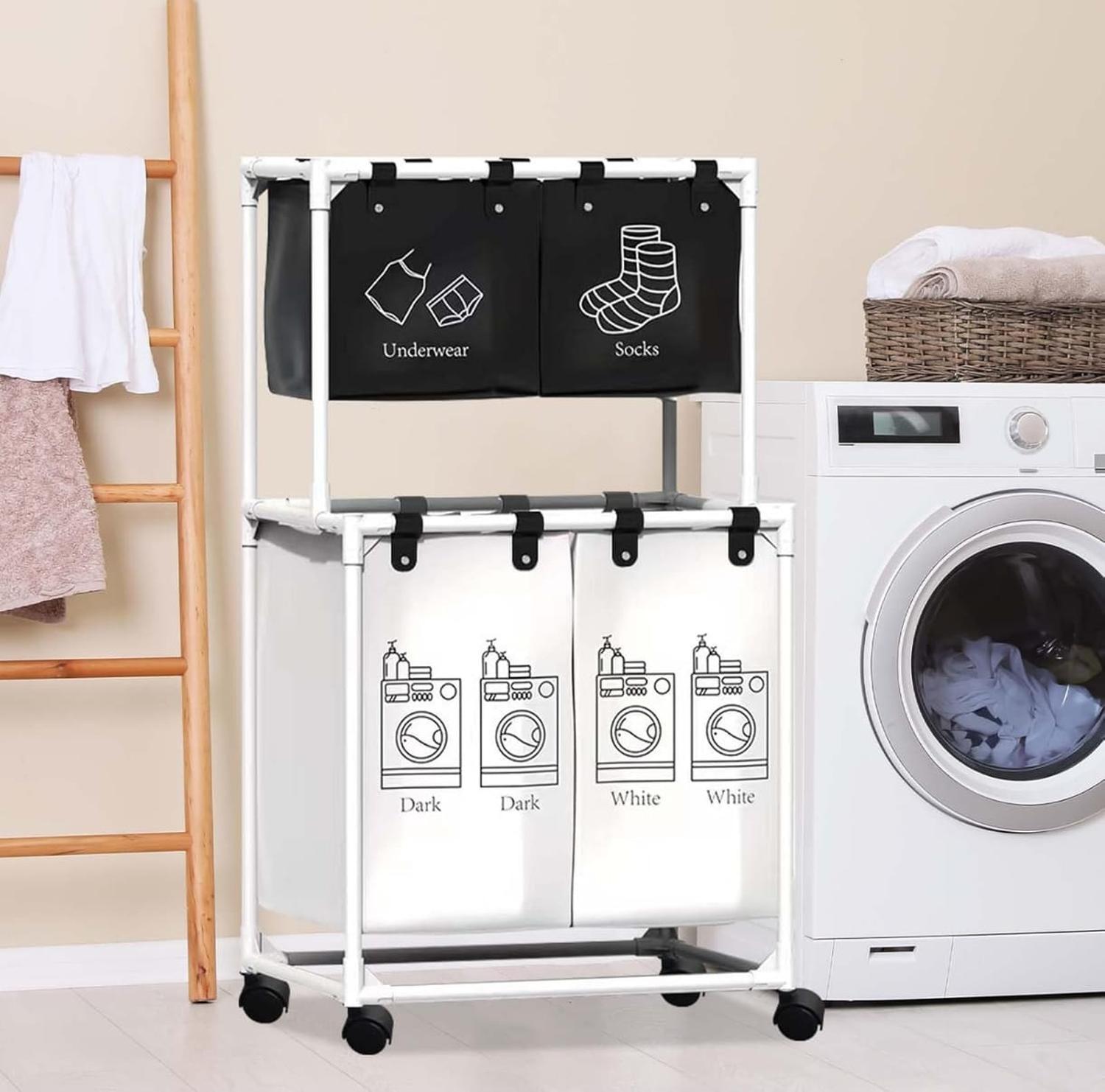 Bolsa de lavandería impermeable extraíble de gran capacidad: este organizador doble de cesta de lavandería tiene una capacidad total de 19 galones (86 litros) y cada forro tiene capacidad para 3.5 galones (15.62 litros)\nBolsa de lavandería Zonal Dirty: este organizador doble de cesta de lavandería tiene una bolsa de lavandería para ayudarte a almacenar ropa de cama y ropa por separado, y 2 bolsillos pequeños para categorizar artículos pequeños como calcetines y ropa interior\nRuedas flexibles para un fácil montaje: ruedas flexibles para un transporte suave de bolsas de lavandería a la lavandería. 4 ruedas están equipadas con frenos de bloqueo. El montaje tarda aproximadamente 15 minutos de acuerdo con las instrucciones detalladas (idioma español no garantizado). El paquete incluye accesorios completos para clasificar ropa y herramientas de montaje.\nResistente y pragmático: hecho de material de PVC resistente y lino de algodón impermeable, este organizador de lavandería ofrece resistencia y estabilidad confiables. El diseño clásico ayuda a evitar sacudidas no deseadas o vuelco accidental.\nCesta de lavandería grande multiusos: esta canasta de lavandería con estante encajará perfectamente en cualquier habitación, baño y dormitorio, ayudándote a ocultar el desorden. Se puede utilizar como decoración y se adapta a la mayoría de estilos de hogar.