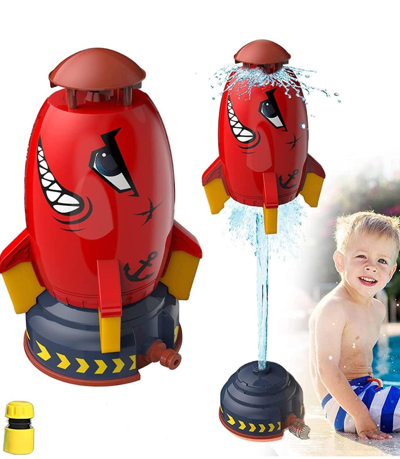 Cohete Aspersor Lanza Agua de Jardín - En este juguete de aspersión infantil, obtendrás un cohete sin diseño y algunas pegatinas bonitas. Puedes diseñar tu estilo favorito con tus hijos. Este es un juguete que puede rociar agua en el aire, lo que puede traer frescura y frescura a los niños y crear una fuente familiar feliz para los niños. Nota: más estable en condiciones de viento.\nPrincipio del juguete de chorro de agua - Este juguete de chorro de agua debe estar conectado a la manguera de salida de agua, que utiliza el impacto del agua para correr hacia el cielo más alto. Las paredes interiores lisas permiten que el cohete se mantenga equilibrado bajo el impacto del agua sin caer. En teoría, el cohete puede golpear a una altura de más de 1,5 metros y girar para detonar el agua.\nMaterial de alta calidad - el cohete está hecho de material ABS respetuoso con el medio ambiente, sin olor, duradero y puede soportar completamente el impacto de la presión del agua en el jardín familiar. Hay que tener en cuenta que hay que abrir lentamente la válvula del grifo. Cuanto mayor sea la presión del agua, mayor será la altura del chorro y más rápida será la velocidad de rotación.\nRegalos para los niños en verano - en el caluroso verano, los niños necesitan agua. Este tipo de aspersor de cohetes solo necesita un tubo para que los niños de todas partes puedan crear "lluvia". Este cohete es el regalo favorito de los niños, ya sea en la piscina, en la playa o en cualquier lugar.