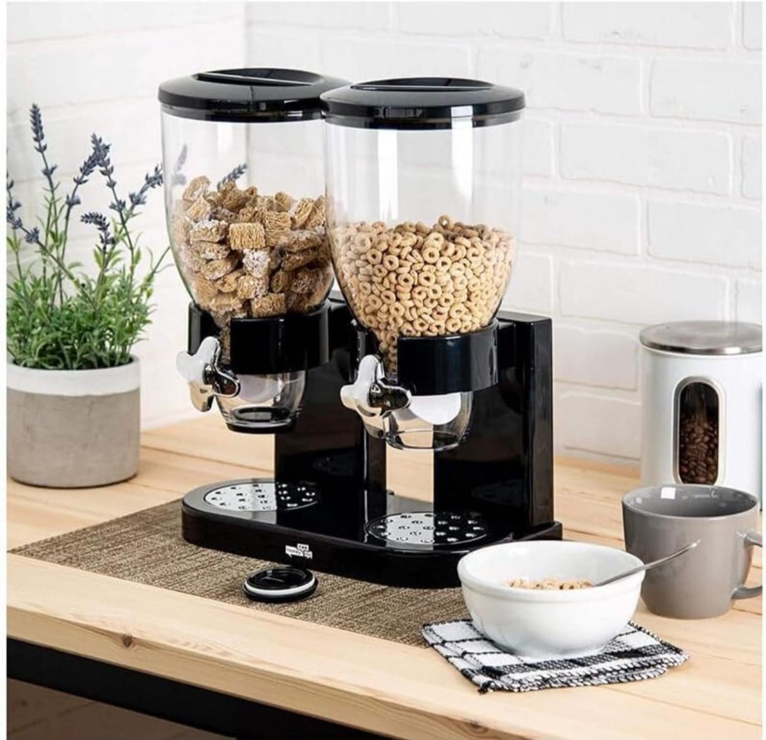 ADECUADO PARA LA COCINA: Su dispensador de alimentos no solo se verá como en casa en cualquier cocina, ¡este moderno dispensador de alimentos secos será un éxito entre las familias! Proporciona una forma divertida y cómoda de dispensar sus alimentos favoritos. Adecuado para alimentos granulados de aproximadamente 0,5 a 3 cm, perfecto como dispensador de dulces, nueces, granola, comida para mascotas y cereales.\n\nGRAN CAPACIDAD Y 1 OZ POR REVOLUCIÓN: Este dispensador de cereales tiene una capacidad de 2 litros y puede contener hasta 17,5 onzas de comida en cada recipiente. Baldes que dispensan exactamente 1 onza por revolución, lo que significa que puede servirle a usted y a su familia la cantidad perfecta independientemente de los ingredientes.\n\nMANTIENE LOS ALIMENTOS FRESCOS: este dispensador de alimentos sella herméticamente para mantener todos los ingredientes frescos, deliciosos y listos para comer durante más de un mes, por lo que no hay absolutamente ningún desperdicio.\n\nFÁCIL DE USAR: Hecho de materiales de calidad alimentaria, su dispensador de alimentos durará toda la vida y es muy fácil de usar y ensamblar, ¡tan fácil como desenroscar!\n\nFÁCIL DE LIMPIAR: si necesita limpiar su dispensador de alimentos secos, todos los componentes y bandejas se pueden quitar fácilmente para que pueda realizar fácilmente una limpieza profunda. Simplemente lave con agua caliente y jabón y séquelo al aire..