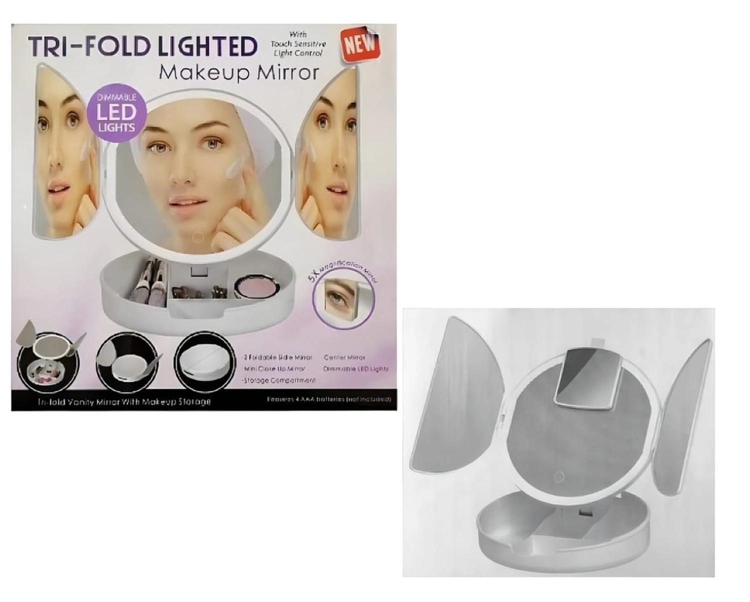 Espejo De Tocador Triple Con Almacenamiento Cosmético Blanco\nEspejo de mesa triple redondo abatible con luces LED blancas integradas.\nEstuche de almacenamiento integrado para brochas, maquillaje y joyas. Vidrio de precisión diseñado para un reflejo cristalino sin distorsión.\nEl espejo central tiene el tamaño perfecto para maximizar los detalles, mientras que los dos paneles laterales plegables le brindan una vista desde cualquier ángulo que necesite.\nIdeal para maquillaje, cuidado de cejas y peinado.\nPequeño espejo desmontable con aumento de 5x incluido.\nAlimentado por batería o USB.\nCable USB incluido.\nRequiere 4 pilas AAA (no incluidas).\nTamaño (plegado): 22x7cm.