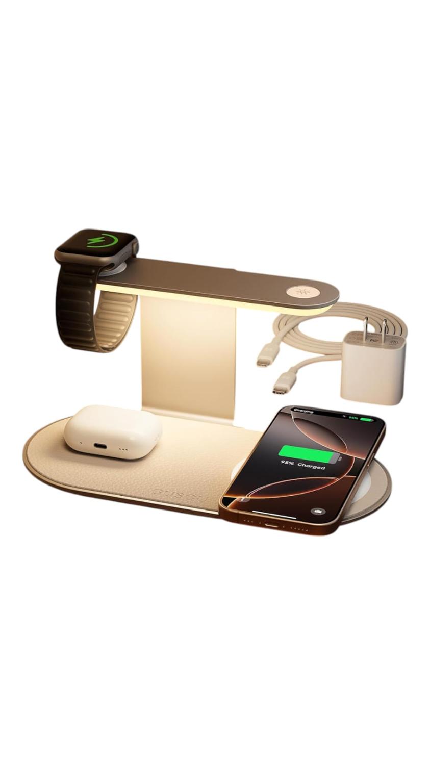Ecosistema inteligente integrado: A medida que muchos dispositivos inteligentes se han convertido en parte integral de nuestras vidas, simplificar el proceso de proporcionarles energía se ha vuelto cada vez más importante. La estación de carga inalámbrica GUSGU 3 en 1 fue diseñada para cargar eficientemente múltiples dispositivos en una variedad de escenarios. Utilice el cargador y el cable equipados para proporcionar un impulso de energía significativo a sus dispositivos inteligentes, revitalizándolos para un rendimiento óptimo.\nExterior metálico: Este cargador adopta un exterior de metal resistente, por lo que es resistente a caídas e impactos. El panel de carga para el reloj está cubierto con cuero, lo que garantiza durabilidad y proporciona una superficie antideslizante. Enciende el teléfono serie 15/14/13/12 en un instante con una carga de alta velocidad de hasta 15 W con una alineación magnética perfecta.\nLuz nocturna LED: la base de carga cuenta con una luz nocturna LED integrada que se puede ajustar a tres niveles de brillo diferentes. Colocándolo en tu mesita de noche, sirve como una estación de carga inalámbrica y una luz nocturna reconfortante que te acompaña durante el sueño.\nCarga segura y rápida: nuestro cargador inalámbrico está equipado con un adaptador de carga rápida QC3.0 y un cable de carga, soportando una potencia máxima de 30W. Permite una carga rápida simultánea de hasta tres dispositivos. La función de carga inalámbrica emplea una tecnología de llenado y parada que pausa temporalmente la carga cuando el dispositivo está completamente cargado. También incorpora monitoreo de temperatura en tiempo real para garantizar una carga eficiente y segura.
