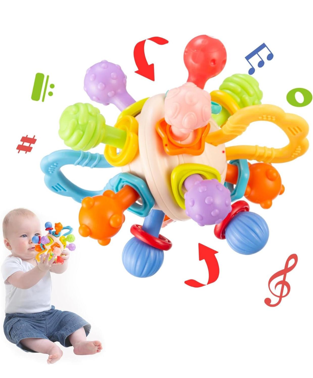 Los juguetes para bebés están hechos de silicona apta para uso alimentario y materiales ABS seguros y no tóxicos. Con una superficie lisa, suave y libre de irritación, estos juguetes de dentición sirven como un remedio excepcional para aliviar las molestias experimentadas durante la etapa de dentición para bebés de 0 a 6 a 12 meses. Además, estos juguetes para bebés no solo proporcionan alivio a las encías doloridas, sino que también ofrecen estimulación sensorial.\n\nFácil de agarrar: Presentamos nuestro último diseño que incluye dos asas, lo que permite un fácil agarre con manos pequeñas. El juguete para bebés, diseñado para bebés de 6 a 12 meses, cuenta con 12 puntos de dentición de silicona. Estos juguetes de dentición mantienen activas las manos del bebé, y el suave sonido de pandereta aumenta su entretenimiento.\n\nLos juguetes de dentición para bebés de 6 a 12 a 18 meses deben esterilizarse completamente antes de su uso. Los juguetes de dentición están hechos de materiales resistentes al calor y se pueden desinfectar con luz UV o hirviéndolos en agua (Nota: hierva durante solo un minuto mientras evita el contacto con el fondo de la olla. Antes de usar, simplemente limpia con toallitas para bebé)\n\nRegalo perfecto de cumpleaños o Navidad para recién nacidos y bebés de 0 a 3, 3 a 6, 6 a 9 y 9 a 12 meses. Este regalo combina una pandereta, un juguete sensorial y un juguete de dentición en un paquete encantador. Estamos seguros de que a todas las niñas y niños les encantará masticar, sacudir y agarrar este juguete