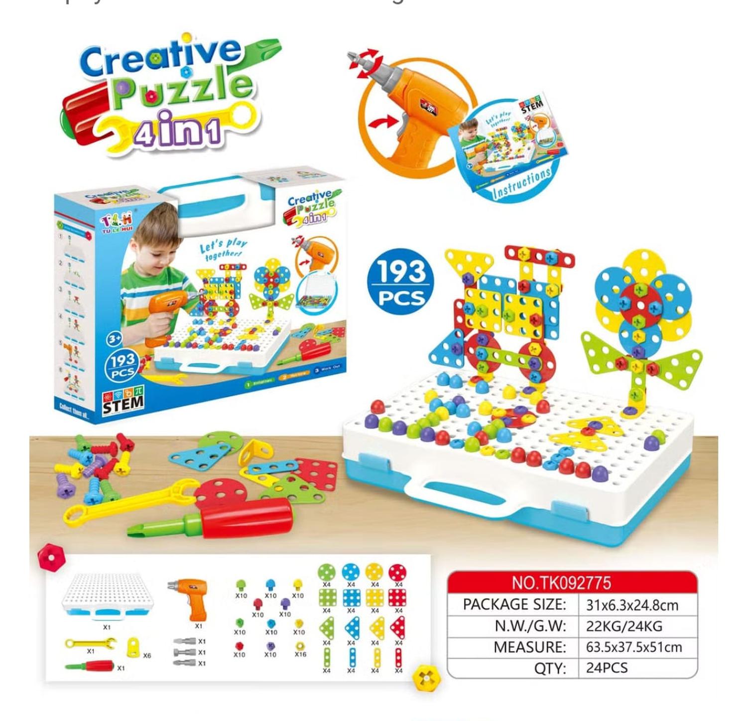 Descripción del Producto\n\n¡Inspira la creatividad y el aprendizaje en tus hijos con nuestro Set de Construcción y Herramientas para Niños! Este completo kit de 30 x 19 x 6 cm incluye 193 componentes y un destornillador eléctrico, proporcionando todo lo necesario para que los niños construyan sus propias escenas en 2D y 3D. Ideal para niños de 4 años en adelante, este juguete fomenta la creatividad y la destreza manual desde una edad temprana, convirtiendo a los pequeños en grandes arquitectos en potencia.\n\nCaracterísticas Principales\n\nKit Completo: Contiene 193 piezas variadas y un destornillador eléctrico, junto con instrucciones detalladas para facilitar el montaje.\n\nDesarrollo Creativo: Perfecto para niños de 4 años en adelante, permite explorar la creatividad y la habilidad artesanal.\n\nJuego Educativo Montessori: Diseñado para niños\n\ndesde los 3 años, con niveles de dificultad que van de simple a complejo. Estimula las habilidades motoras finas y la curiosidad.\n\nFomenta el Pensamiento Espacial: El juego de perforar y quitar tornillos ayuda a desarrollar la imaginación, la memoria y el aprendizaje sensorial.\n\nPortátil y Práctico: Su diseño compacto facilita el transporte, permitiendo llevar el set al aire libre para disfrutar en familia.\n\nBeneficios Educativos\n\nHabilidades Motoras Finas: Mejora la destreza manual y la coordinación ojo-mano.\n\nCreatividad e Imaginación: Ofrece un juego abierto lleno de posibilidades para desarrollar la creatividad y la capacidad de resolver problemas.\n\nAprendizaje Sensible y Espacial: Fomenta el pensamiento lógico y el aprendizaje sensorial a través de la manipulación de piezas y herramientas.