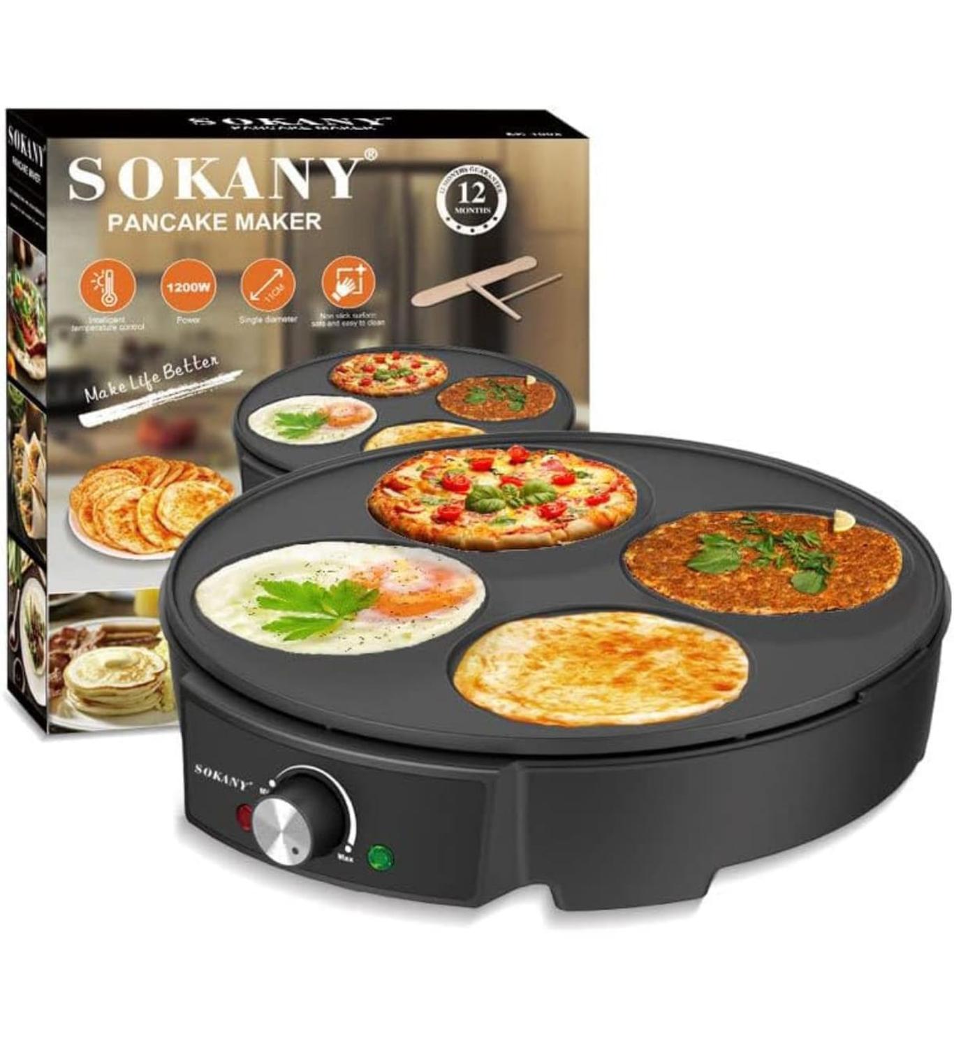 1200W Potencia: Tiene una potencia máxima de 1200W, distribución uniforme del calor para una cocción perfecta.\nMultifuncional: Esta máquina de crepes es multifuncional y además de crepes también se pueden preparar tortillas, hojuelas, tortitas de maíz, huevos, carnes, bistecs, mariscos, etc.\nFácil de limpiar: La placa de gran tamaño para hacer creps tiene un recubrimiento antiadherente para evitar que la masa se pegue.\nControl de la temperatura: Puede ajustar la temperatura de cocción con ayuda del regulador de potencia ya que según el tipo de tortitas que vaya a hacer, La temperatura de calentamiento no debe superar los 50-210ºC.