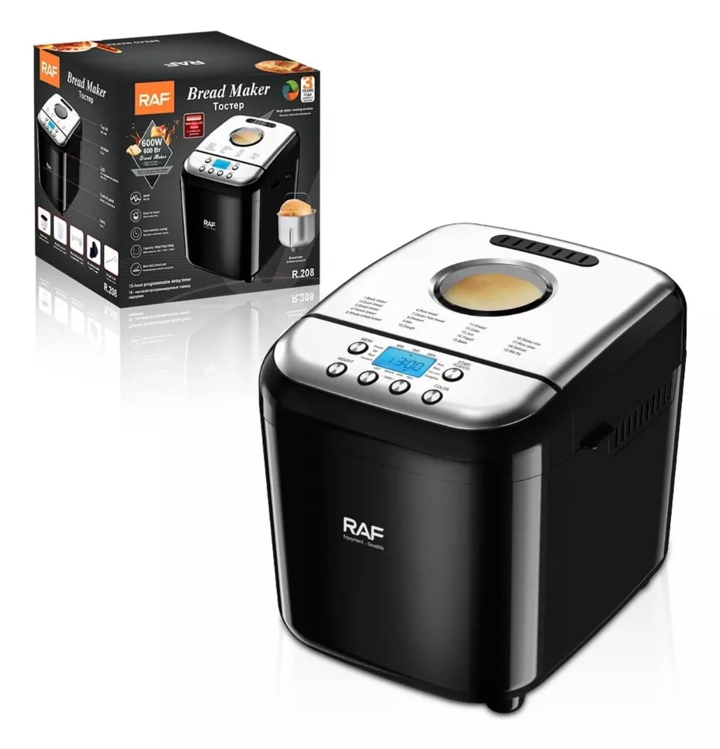 Descripción\n\nMáquina de Hacer Pan RAF R-208-19 Programas, 600W, Acero Inoxidable, Pan Casero y Masas\n\nVariadas\n\nDescripción mejorada:\n\nLa Máquina de Hacer Pan RAF R-208 es ideal para los amantes del pan casero fresco. Con 19 programas ajustables, puedes preparar desde pan blanco tradicional hasta recetas gourmet. Su motor de 600W garantiza un horneado rápido y uniforme, mientras que su construcción en acero inoxidable asegura durabilidad y una fácil limpieza. Además, esta máquina no solo amasa y hornea pan, sino que también es perfecta para preparar masas de pizza, pasteles y mucho más.\n\nCaracterísticas destacadas:\n\nVersatilidad total: 19 programas automáticos para diversas recetas.\n\nEficiencia y potencia: Motor de 600W para resultados rápidos y uniformes.\n\nFácil de limpiar: Diseño en acero inoxidable resistente.\n\n\nPanel intuitivo: Botones sencillos para ajustar configuraciones y programas.\n\nCapacidad de hasta 1 kg: Ideal para hogares pequeños y medianos.