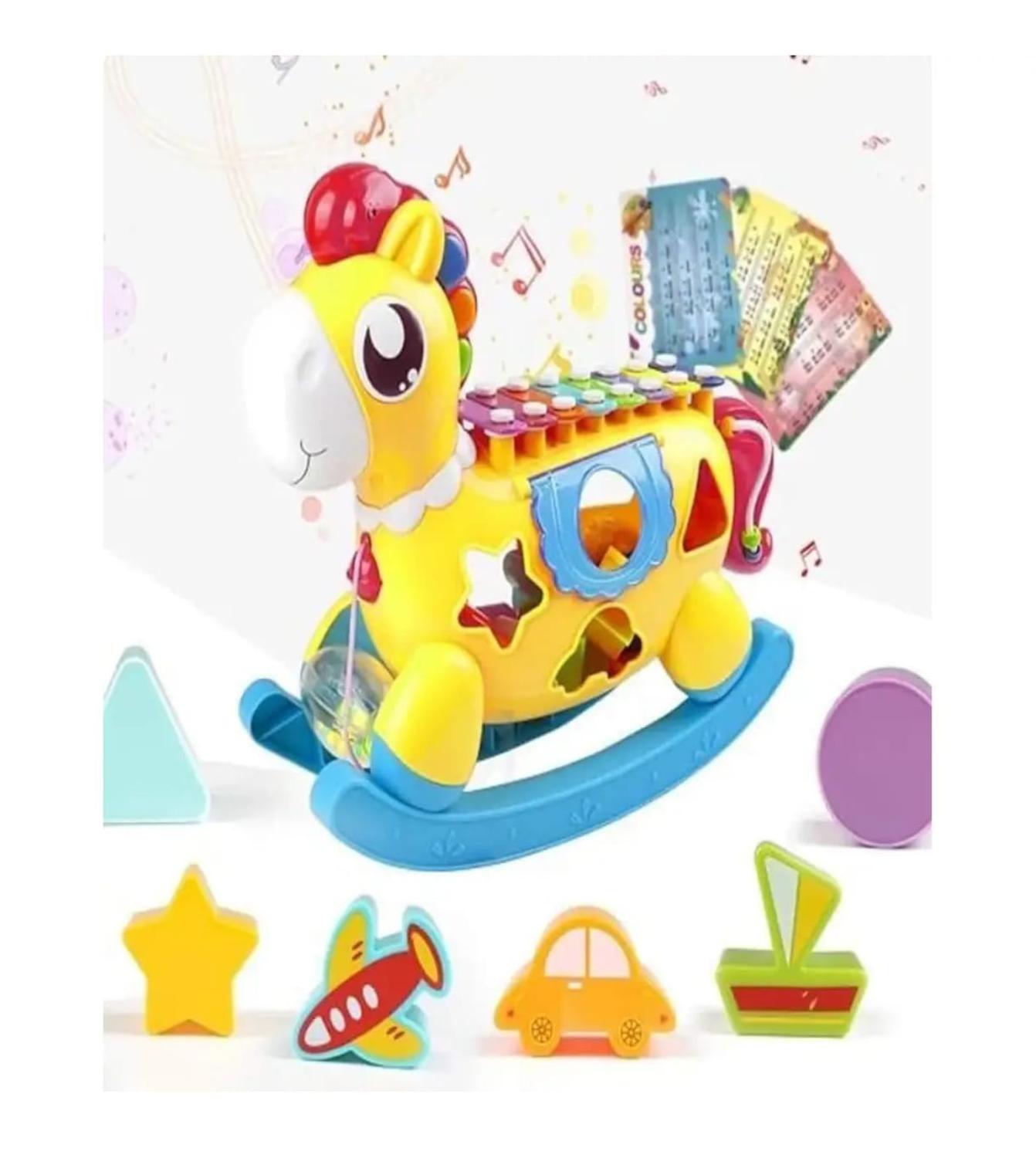 Juguete musical multifuncional para bebés: como un juego de piano para niños y xilófono electrónico, este juguete musical para niños pequeños tiene un alto estímulo visual para atraer la atención del bebé y ayudar a la iluminación educativa al jugar y aprender. Canciones realistas y lindas para bebé. Los juguetes musicales de pony pueden mejorar la capacidad interactiva del bebé, ayudar a entrenar la percepción de los sentidos, formas y colores para lograr una iluminación musical temprana.\nJuguete colorido de xilófono: 7 tonos diferentes se pueden distinguir por diferentes colores de xilófono, lo que también puede ayudar a los bebés a reconocer los colores. El pony de juguete tiene 7 formas brillantes y fáciles de agarrar. El bebé puede combinar los bloques de construcción con los agujeros correspondientes en el vientre del pony para ejercitar la coordinación ojo-mano del niño.\n\nJuguete de aprendizaje para niños: alrededor de la pista original de las cuentas magnéticas, flexibilidad de ejercicio, concentración y coordinación ojo-mano. Los niños pueden jugar de forma independiente durante mucho tiempo. Un gran juguete sensorial para promover la comunicación entre padres e hijos.\n\nDiseño de alta calidad y seguridad: Adoptado material ABS respetuoso con el medio ambiente, el borde es suave, duradero, anticaídas, antiarañazos y contiene pintura a base de agua, no tóxica. Un juguete musical seguro para el bebé.\nEl mejor regalo para bebés niños y niñas: este juguete musical para niños pequeños tiene una apariencia bonita y un color brillante, como un juguete educativo de música de acción, centro de actividades de juegos para bebés, juguete de juego preescolar. Adecuado para educación temprana, regalo de cumpleaños, regalo de Navidad, día del niño, regalo de vacaciones o simplemente como un nuevo regalo para bebés, niños y niñas.