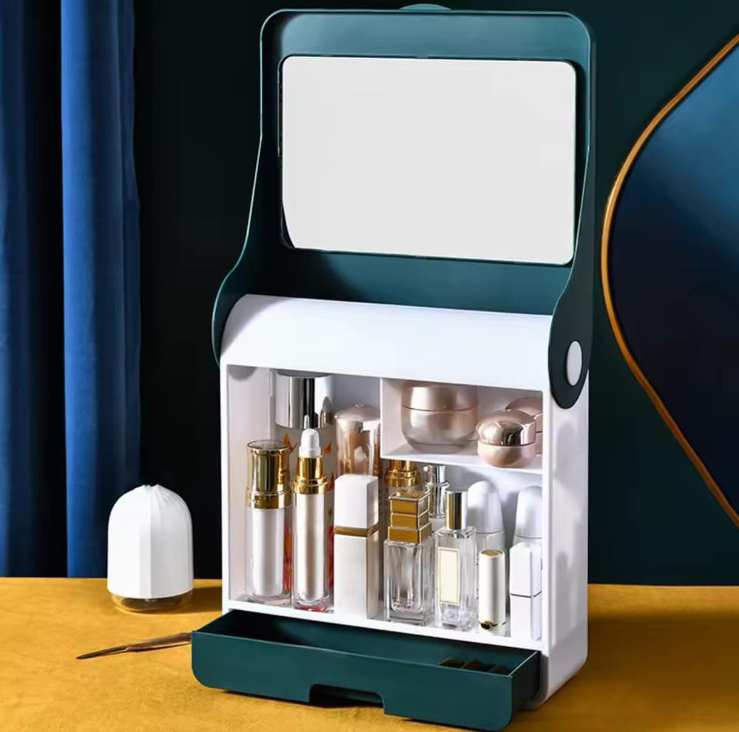 Organizador de maquillaje con espejo: el organizador de maquillaje está equipado con un espejo, adecuado para maquillaje sentado o de pie. Este soporte profesional de almacenamiento de maquillaje puede mantener tus cosméticos seguros con él firmemente colgando en tu pared, seguro y organizado, un compañero perfecto para baño, dormitorio y mesa de maquillaje.\nDiseño montado en la pared y ahorro de espacio: diseñado con una idea de eficiencia de espacio, este gabinete no ocupará ningún espacio en el piso y podría contribuir a la mejora interior de su hogar.\nEspacio de almacenamiento de gran capacidad: los compartimentos y cajones divididos son adecuados para la mayoría de tamaños de cosméticos, como lápices labiales, bases, rubores, sombras de ojos, lápices de cejas, máscaras faciales, perfumes y accesorios de joyería, manteniendo tu escritorio ordenado.\nA prueba de polvo y resistente al agua: esta vitrina cosmética está hecha de plástico ABS y PS no tóxico. Se puede utilizar en escritorios, encimeras, baños, oficinas, dormitorios, salas de estar, tocadores y durante los viajes. La superficie es fácil de limpiar.\nElección de regalo: este juego incluye una caja de almacenamiento de cosméticos. La caja de almacenamiento de maquillaje es un gran regalo para cumpleaños, Año Nuevo, Navidad, Día de San Valentín, Día de la Madre y muchas otras vacaciones, para regalar a tu espos@, novi@ ,hij@, madre o cualquier otra persona especial en tu vida.
