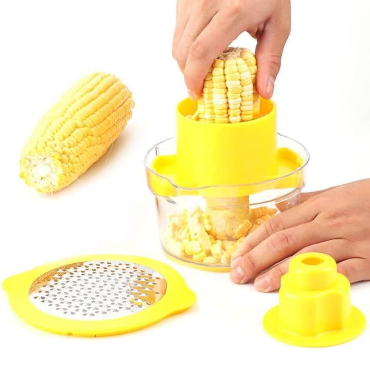 Trituradora rápida de maíz: Trituradora de maíz rápida y segura, pelar maíz un buen ayudante, solo necesitas segundos para pelar, taza de almacenamiento 4 en 1 + cepilladora de maíz+cepilladora + asa de agarre (protege las manos de lesiones), también se puede utilizar para afeitar ajo y jengibre. Y ve a pieles de papa, etc. Electrodomésticos de cocina multiusos.\nBueno de usar: alta calidad, sin electricidad, sin ruido, parte inferior antideslizante: el anillo de silicona antideslizante en la parte inferior mantiene el cuenco en su lugar, puedes llevarlo a cualquier lugar.\nUn accesorio de cocina esencial para los entusiastas de la cocina casera: fácil de limpiar, maíz pelado de alta eficiencia, construido con plástico duradero, para asegurarse de que puede durar mucho tiempo.\nPequeño y fácil de transportar: este pelador de maíz con diseño que ahorra espacio también es ideal para usar en una barbacoa en el parque, playa o campamento. Ideal para cocinar juntos, como repuesto o como regalo para familiares o amigos.