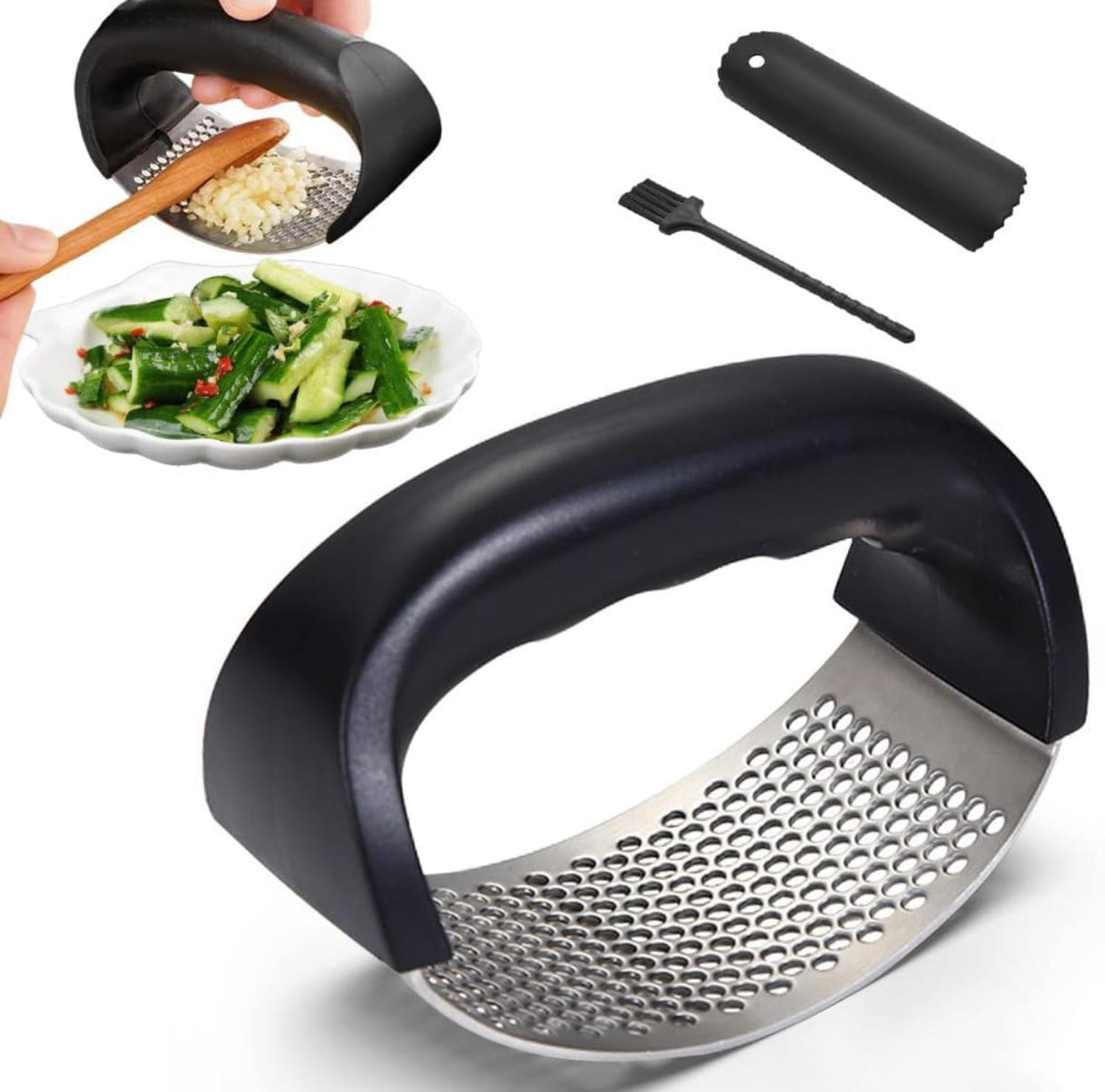 Prensadora De Ajo Acero Inoxidable\nPrensador de ajo de acero inoxidable: diseñado con un mango cómodo, esta prensa de ajo garantiza la salida con una presión mínima en los dedos, manos y muñecas, por lo que es ideal para personas con agarre débil o manos pequeñas.\nDiseño que ahorra tiempo: herramienta de picadora de ajo con un movimiento de balanceo de ida y vuelta, puedes triturar o picar fácilmente ajo en la mitad del tiempo habitual, optimizando tu proceso de cocción.\n【Balancín de prensa de ajo】La limpieza es muy fácil con este triturador de ajo: enjuágalo con agua corriente o mételo en el lavavajillas para una limpieza completa, ahorrándote tiempo y esfuerzo.\nPicadora de ajo: hecha de acero inoxidable de alta calidad y ABS, esta picadora de ajo está diseñada para durar, asegurando durabilidad y longevidad en tus herramientas de cocina.\nRegalo cuidadoso: perfecto para el Día de la Madre, esta trituradora de ajo es un regalo reflexivo y práctico para tu madre o esposa, ayudándoles a simplificar su experiencia de cocina y elevar sus creaciones culinarias.
