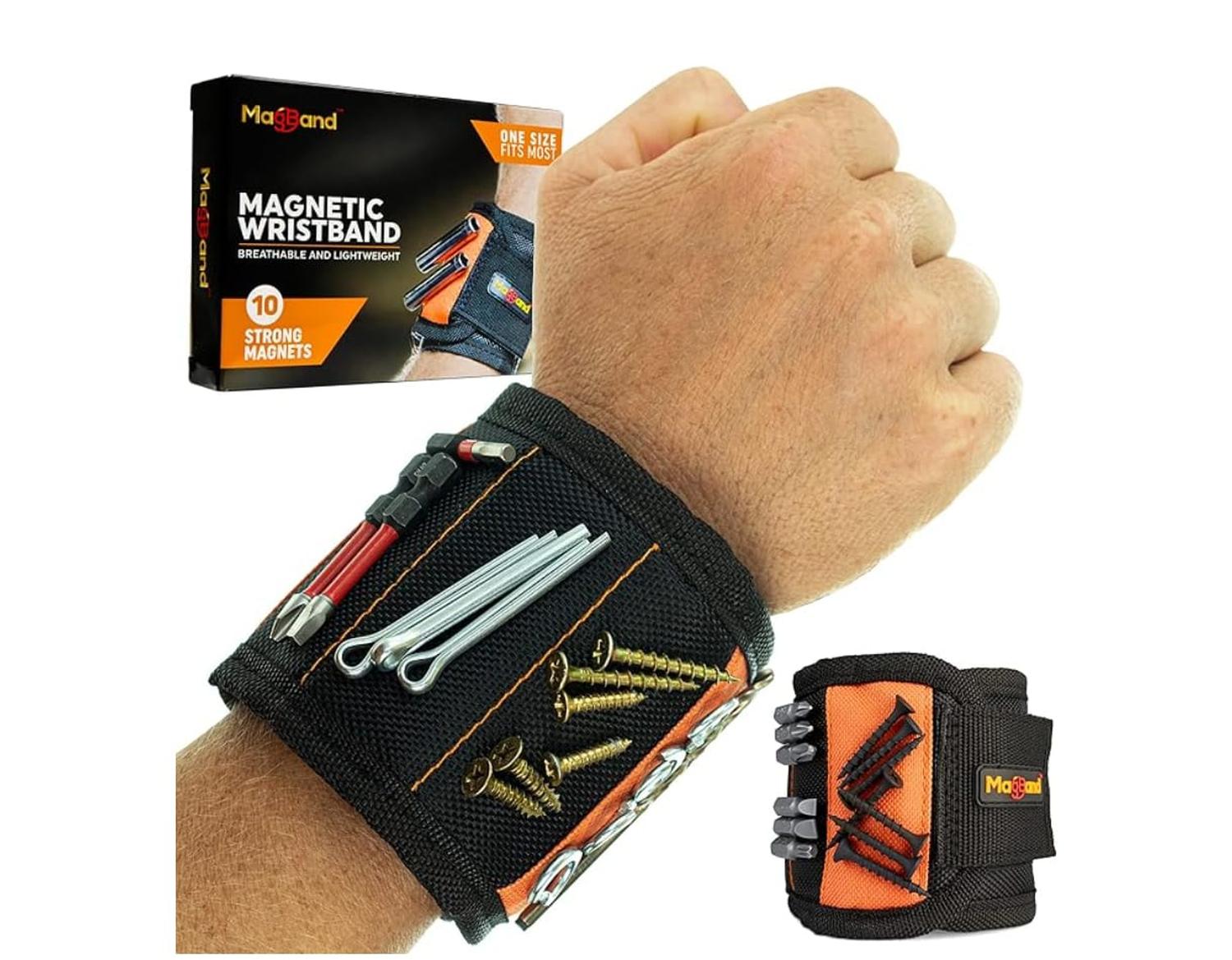 Este accesorio de herramienta magnética ajustable Magband contiene 5 potentes imanes que están incrustados en nuestras pulseras para sujetar tornillos, clavos, pernos, arandelas y brocas con facilidad. Puedes atarlo a la muñeca, un cinturón o colgarlo sobre el banco de trabajo.\nTen tus herramientas a mano Estás cansado de ir y venir para agarrar un tornillo o clavo mientras intentas hacer reparaciones o terminar un proyecto de bricolaje Simplemente ata nuestra pulsera magnética multiuso y mantén todo de forma segura al alcance mientras trabajas sin el volumen añadido de un cinturón de herramientas. Los accesorios como este son perfectos para ti o para la persona que amas.\nSoporte para herramientas de pulsera súper fuerte. \n5 potentes imanes están incrustados en una malla ligera para sostener pequeños accesorios para un fácil acceso. Ideal para mejoras del hogar, construcción y reparación de automóviles. Banda portátil y compacta ideal para espacios reducidos\nTalla única Su diseño único, fabricado con tela de nailon Oxford balístico 1680D y malla interior transpirable, hace que esta pulsera de herramientas se ajuste perfectamente a casi cualquier muñeca. También se puede envolver alrededor de su bíceps, antebrazo o unirse a su cinturón. Como una caja de herramientas portátil\nIdeal para regalos. Este soporte magnético para tornillos de muñeca es el regalo perfecto para papás, maridos, novios, cumpleaños, mecánicos, carpinteros, manitas, ávidos o cualquier manitas o mujer en tu vida. Ahorra tiempo y energía con esta práctica pulsera magnética