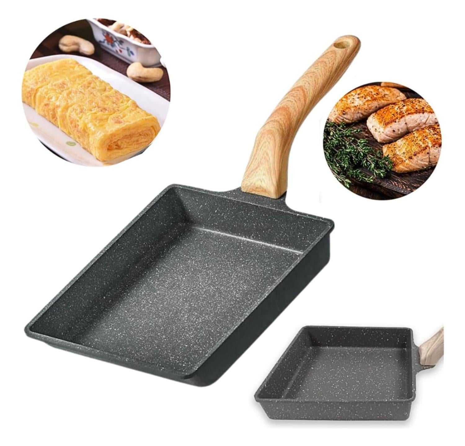 Material antiadherente saludable: la sartén SKEAP tamagoyaki 100% libre de PFOS, PFOA, nuestros utensilios de cocina garantizan tu cocina diaria de una manera más saludable y segura. Con la sartén SKEAP tamagoyaki, sin humo, verde y saludable, te proporcionaremos una dieta saludable con un ambiente de cocina menos humo.\nInteligente: la base conductora magnética de acero inoxidable hace que esta sartén se pueda utilizar tanto en estufa de gas, placa de inducción, estufa eléctrica como estufa de vidrio. El diseño inferior de acero inoxidable es extremadamente duradero, evita la deformación a tiempo. El aluminio fundido proporciona una buena retención de calor y difusión.\nMás que la sartén para tortillas: debido a su tecnología antiadherente mejorada, esta sartén para tortilla es para que puedas voltear perfectamente los huevos, sándwiches, panqueques, bistec de res, tortillas y otros alimentos deliciosos.\nMango ergonómico de madera maciza: el cuerpo cuadrado de la sartén para tortilla y el mango de madera maciza tienen un diseño de separación, el mango se instala y desmonta fácilmente sin herramientas. El mango de la sartén de madera maciza es cómodo de sostener, no tóxico e inofensivo a altas temperaturas.